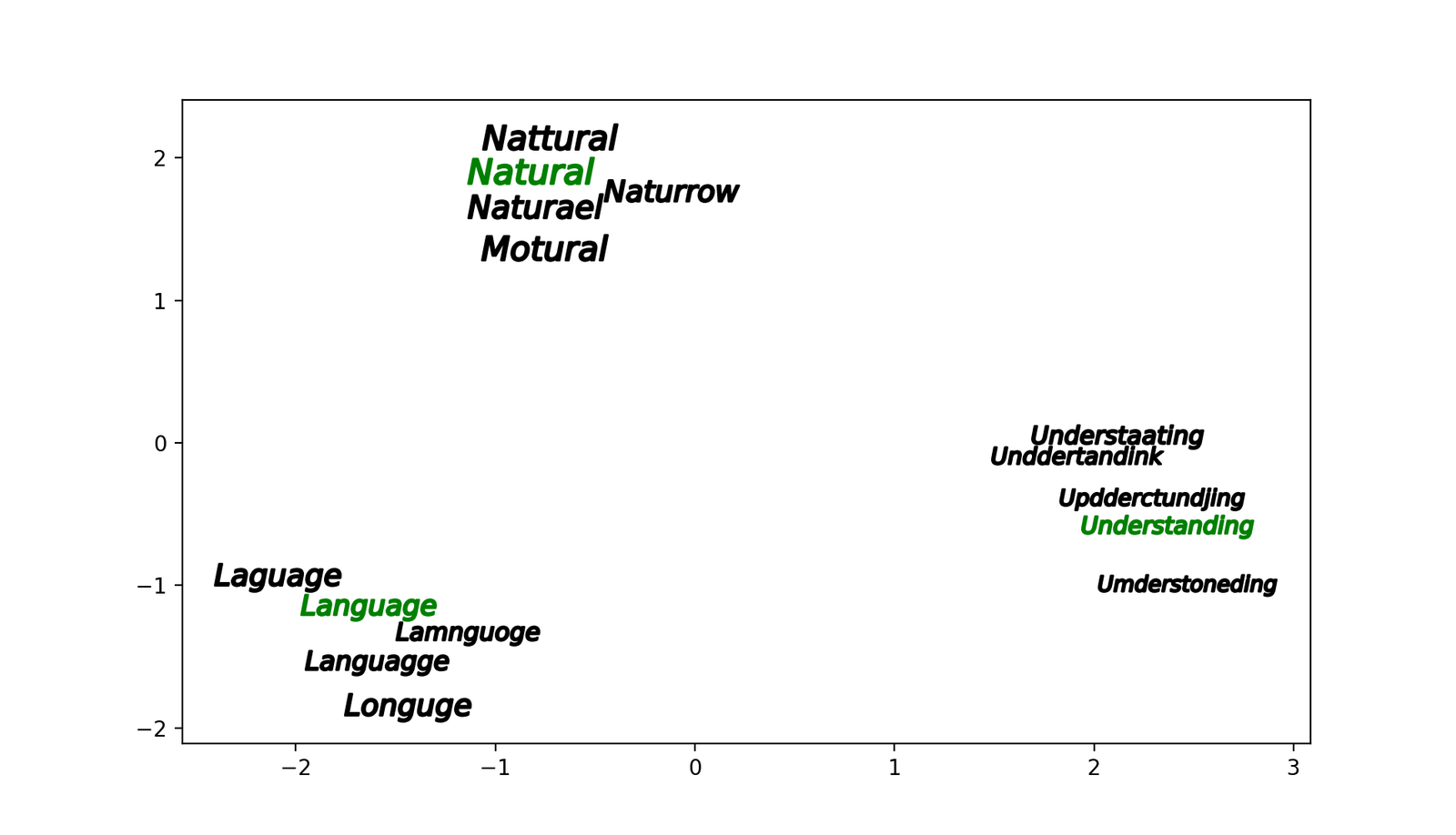 为了解决这个问题,前文提到过,我们需要使用一个能够创建出词嵌入的语言模型,创建过程完全根据拼写,并且将向量根据其表示的词之间的相似性排序。