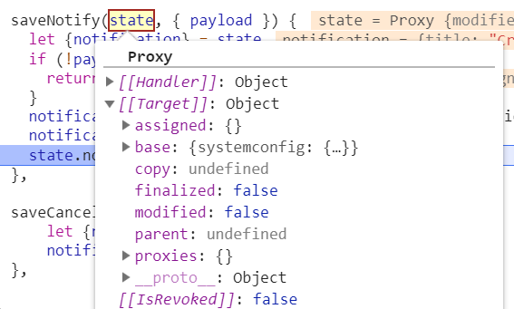 这就是为什么我们可以直接操作传入的state,改变其值,因为此时传入的state并不是最原始的state,而是一个Proxy对象,当我们改变它的值,immer会自动和初始state做merge的操作。如下图所示: