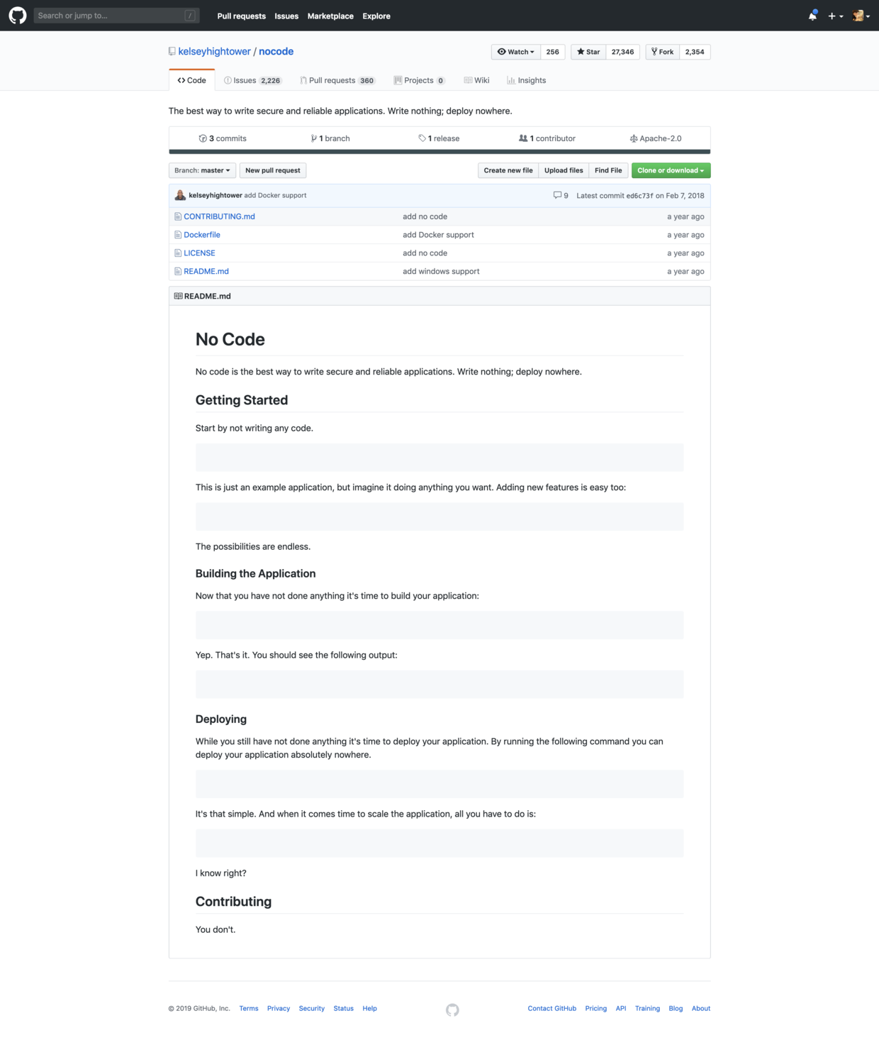 "如果你的程序没有bug, 只能说明它不够复杂", 这是一个放弃治疗的仓库! No Code仓库里没有任何代码, 但却有数量不菲的star, 属于Github里面的名场面, 推荐游览~