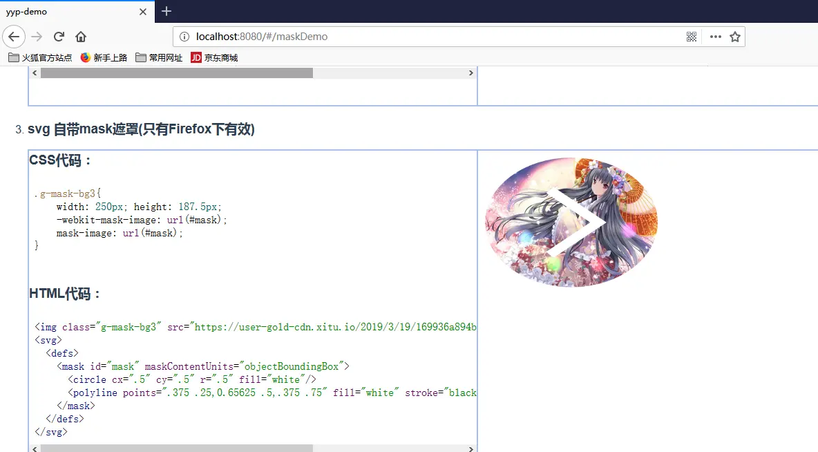 此属性指mask遮罩使用的图形资源,初始值为none,可使用url()图片遮罩,svg,cross-fade(url(),url(),50%)(图片透明叠加)以及各种CSS的渐变属性。语法上可支持url()功能符,image()功能符(目前Chrome和Firefox都尚未支持,所以不介绍了),甚至是element()功能符(但只有Firefox浏览器支持,并且需要-moz-私有前缀)。