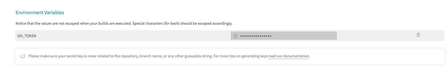 同样的, boilerplate 已经准备好 .travis.yml 文件,唯一需要我们操作的是在 github.com/settings/to… 上生成 token,在 www.travis-ci.org/ 构建之前配置 Environment Variables,GH_TOKEN