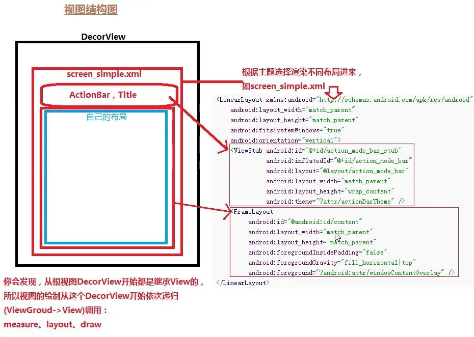 1.系统会创建顶层布局容器DecorView,DecorView继承自FrameLayout,是PhoneWindow对象持有的一个实例,它是所有应用的顶层View,在系统内部进行初始化;