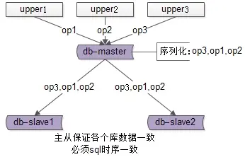数据库的主从架构,上游分别发起了op1,op2,op3三个操作,主库master来序列化所有的SQL写操作op3,op1,op2,然后把相同的序列发送给从库slave执行,以保证所有数据库数据的一致性,就是利用“单点序列化”这个思路。