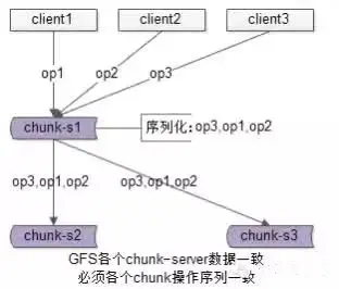 GFS(Google File System)为了保证文件的可用性,一份文件要存储多份,在多个上游对同一个文件进行写操作时,也是由一个主chunk-server先序列化写操作,再将序列化后的操作发送给其他chunk-server,来保证冗余文件的数据一致性的。