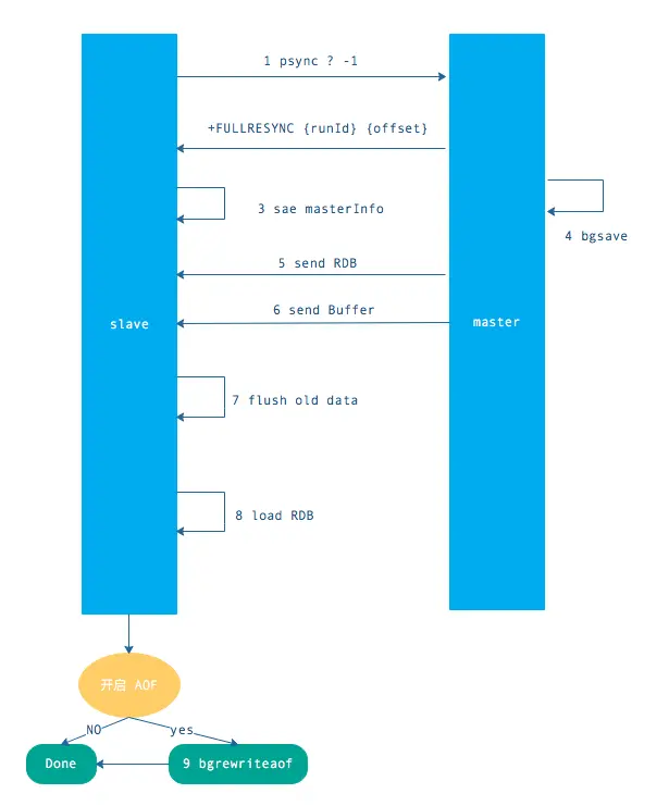 流程说明:从节点发送 psync 命令给主节点,runId 就是目标主节点的 ID,如果没有默认为 -1,offset 是从节点保存的复制偏移量,如果是第一次复制则为 -1.