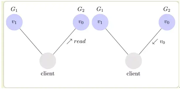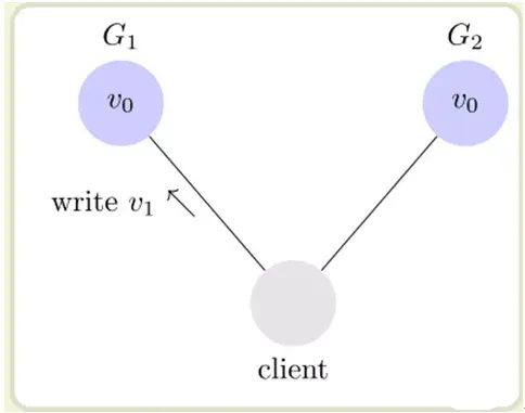 问题是,用户有可能向 G2 发起读操作,由于 G2 的值没有发生变化,因此返回的是 v0。G1 和 G2 读操作的结果不一致,这就不满足一致性了。
