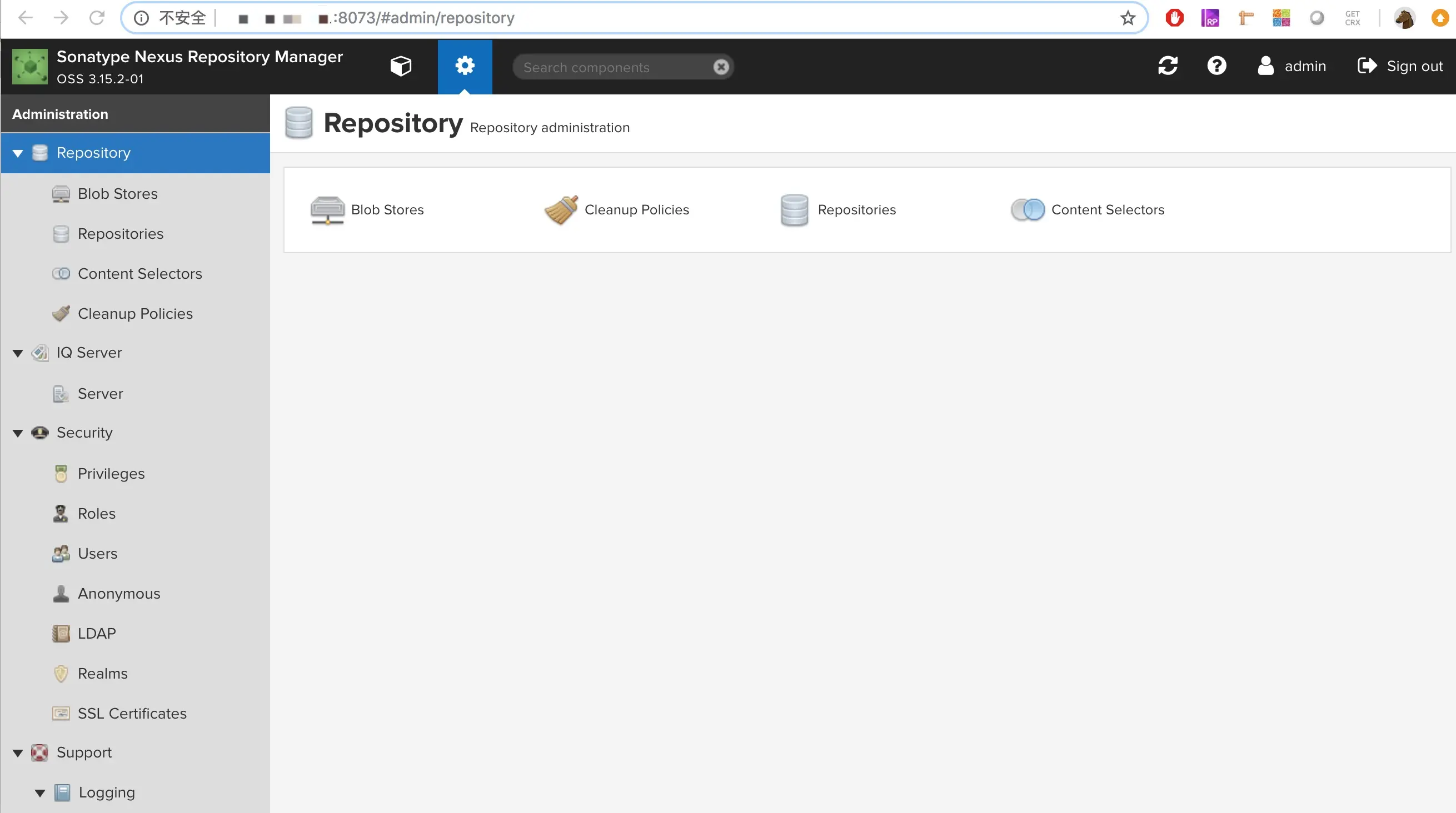 $ tail -f /opt/sonatype-work/nexus3/log/nexus.log至此,nexus 服务已搭建完毕!可使用默认账号admin/admin123 登录ip:8073后对npm仓库进行管理