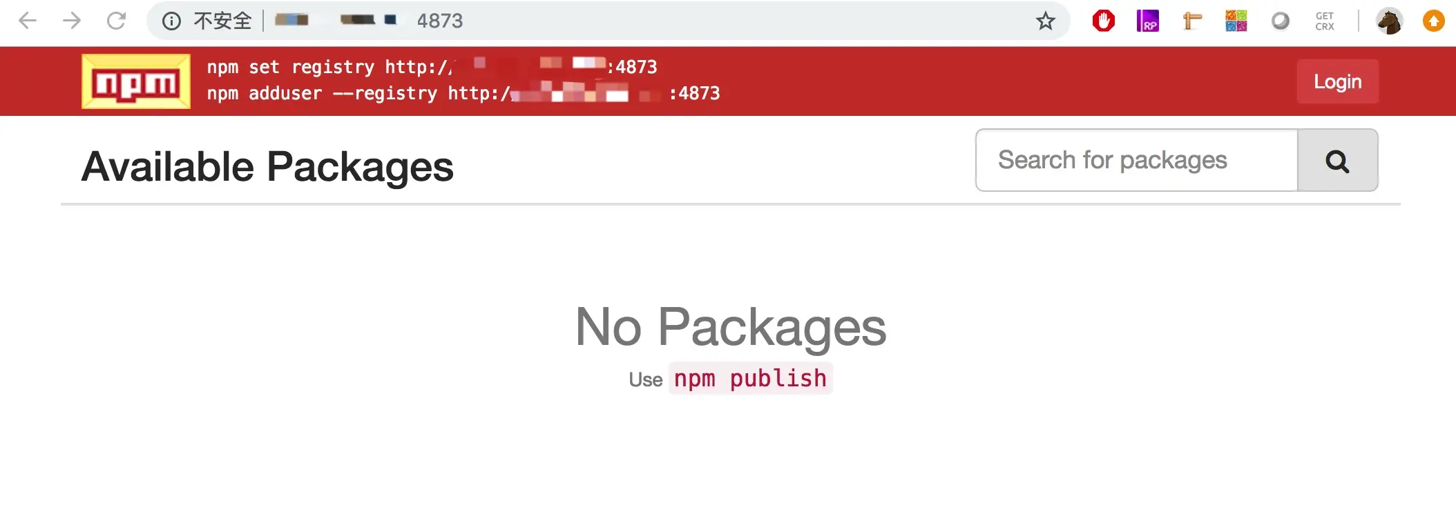 npm adduser --registry http://xxxxx:4873/,设置相应的用户名、密码、邮箱后即可登录、发布包。如果将配置项max_users设为-1,表示禁用 npm adduser 命令来创建用户,需手动在htpasswd文件中添加用户信息来初始化用户。