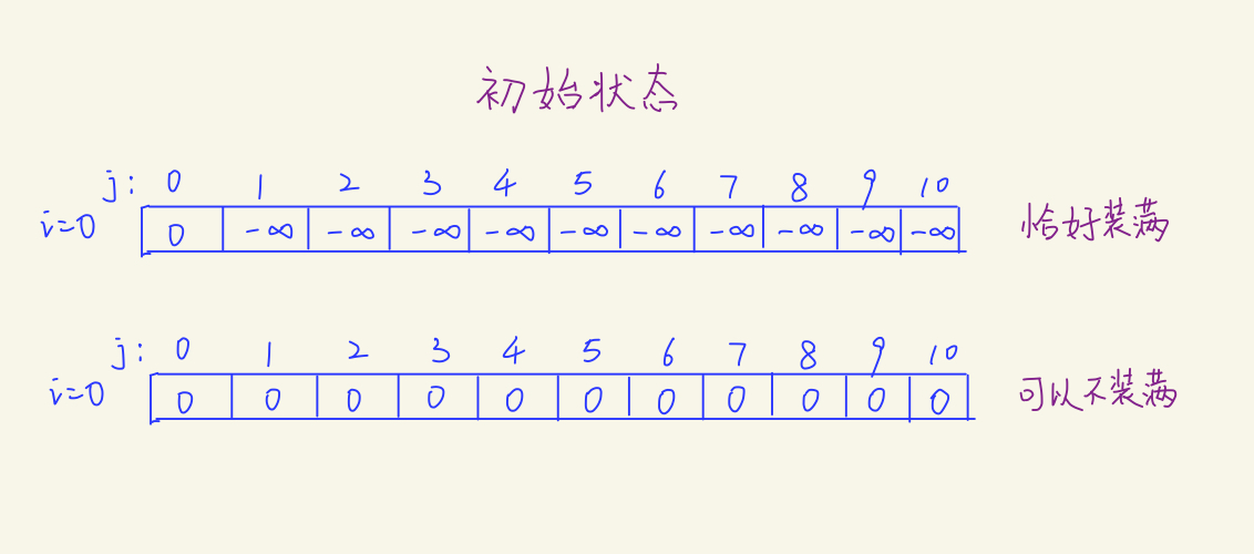 为什么呢?因为初始化的数组,实际上是在没有任何物品可以放入背包的情况下的合法状态。如果要求背包恰好装满,那么此时只有容量为0的背包可以在什么都不装且价值为0的情况下被“恰好装满”,其他容量的背包均没有合法的解,因此属于未定义的状态,应该设置为负无穷大。如果背包不需要被装满,那么任何容量的背包都有合法解,那就是“什么都不装”。这个解的价值为0,所以初始状态的值都是0。