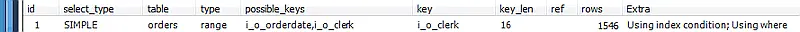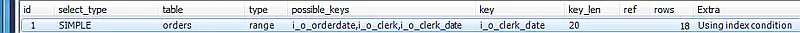 | range | i_o_orderdate, i_o_clerk | i_o_clerk | 1546 | 0.234 | Using index condition; Using where | 18 |