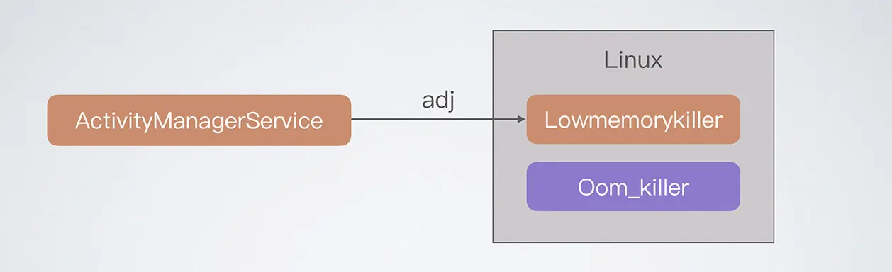 Lowmemorykiller:ActivityManagerService中trimApplications() 函数中会执行一个叫做 updateOomAdjLocked() 的函数,updateOomAdjLocked 将针对每一个进程更新一个名为 adj 的变量,(用来表示发生内存不足时杀死进程的优先级顺序)并将其告知 Linux 内核,内核同样维护一个包含 adj 的数据结构(即进程表),并通过 lowmemorykiller 检查系统内存的使用情况,在内存不足时,遍历所有进程,选出低优先级的进程杀死,最终由内核去完成真正的内存回收。