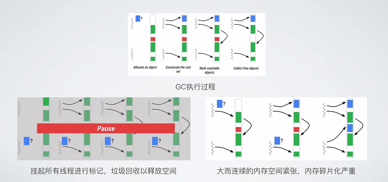 Dalvik垃圾回收过程:GC会去标记和查找所有可访问到的活动对象,这个时候整个程序的线程就会挂起,并且虚拟机内部的所有线程也会同时挂起(左下图) 。之所以要挂起所有线程是确保:所有程序没有进行任何变更,与此同时GC会隐藏所有处理过的对象,最终确保标记了所有需要回收的对象后,GC才会恢复所有线程,并释放空间。