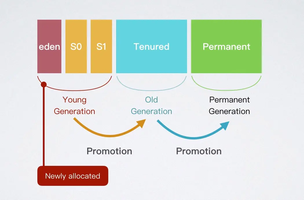 对象分配过程:最近分配的对象会存放在新生代区域,新生代区域分为eden区(伊甸园,圣经中指上帝为亚当夏娃创造的生活乐园)、so区和s1区,s1和s0区也被称为from区和to区(合称Survivor区),他们是两块大小相等并且可以互换角色的空间,绝大多数情况下,对象首先分配在eden区,在一次新生代回收后,如果对象还存活会进入s0或者s1区,之后每一次gc,存活的对象年龄都会相应增加,当达到一定年龄则会进入老年代,最后累积一定时间再移动到持久代区域。系统会根据内存中不同的内存数据类型分别执行不同的gc操作。