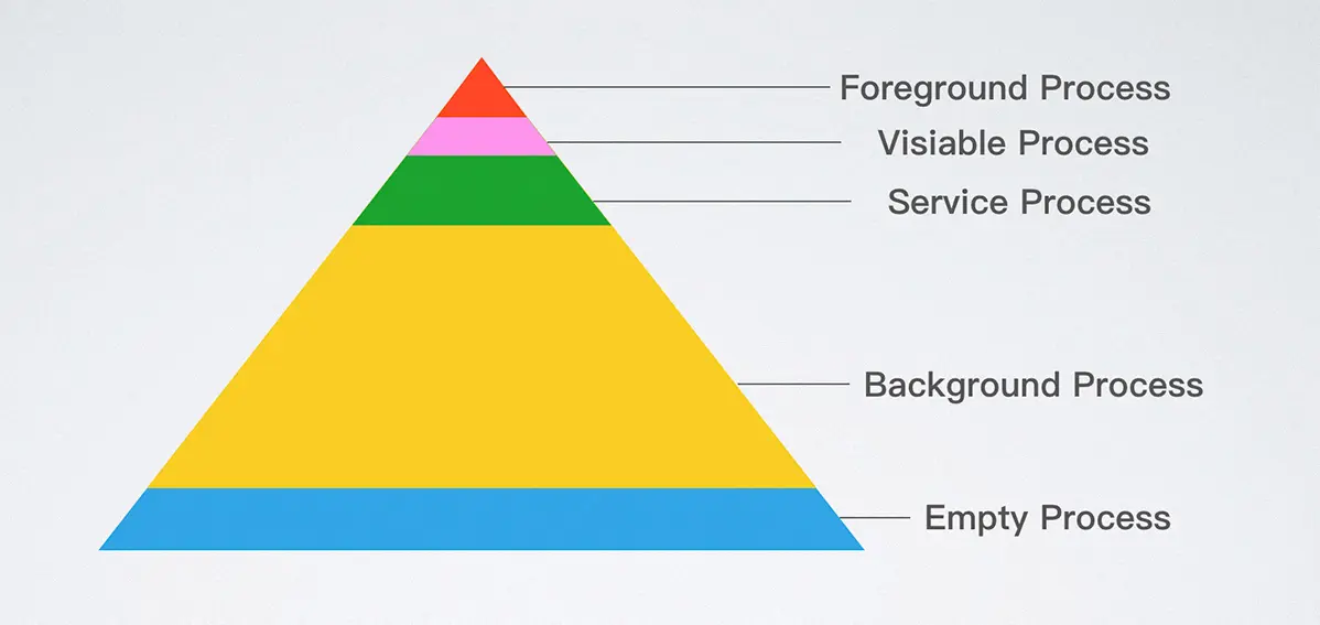 进程生命周期:Android 系统将尽量长时间地保持应用进程,但为了新建进程或运行更重要的进程,最终需要移除旧进程来回收内存。 为了确定保留或终止哪些进程,系统会根据进程中正在运行的组件以及这些组件的状态,将每个进程放入“重要性层次结构”中。 必要时,系统会首先消除重要性最低的进程,然后是重要性略高的进程,来回收系统资源。(一般情况下前台进程就是与用户交互的进程了,如果连前台进程都需要回收那么此时系统几乎不可用了)。由此也衍生了很多进程保活的方法(提高优先级,互相唤醒,native保活等等),出现各种杀不死的进程的APP。