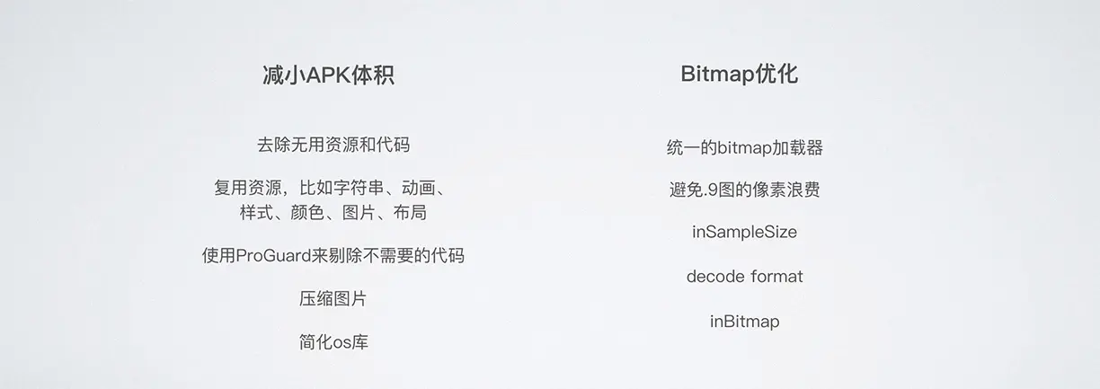 降低运行时内存可以分为减小APK的体积和Bitmap优化两部分: