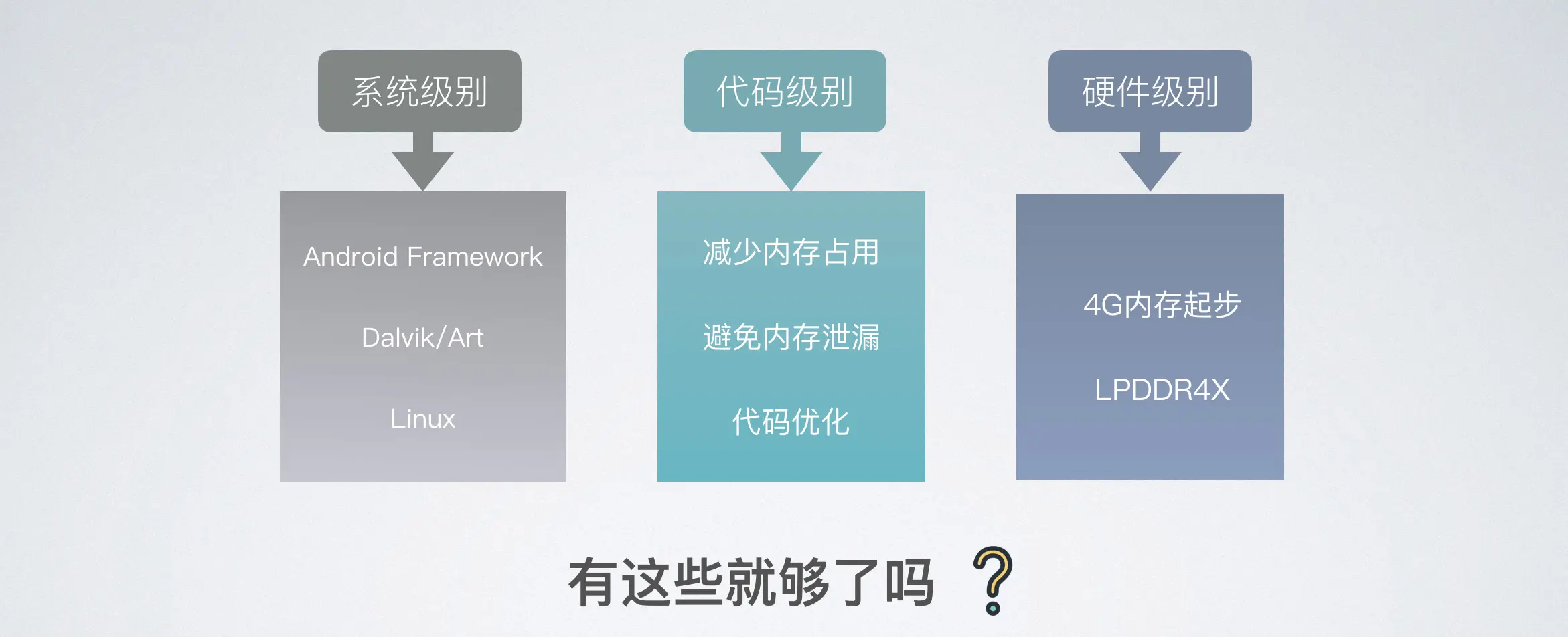 前面我们已经从系统级别了解了Android Framework、Darlvik/Art虚拟机、Linux在内存分配上的原理,接着又在代码级别分别从减少内存占用、避免内存泄漏和代码优化三个方面介绍了如何避免内存问题,再加上当前科技发展是如此迅速,4GB内存已经是很常见的手机配置。LPDDR4X的高速闪存也越来越被广泛的使用。对于内存优化我们是不是就已经可以高枕无忧了,有上面这些就够了吗?