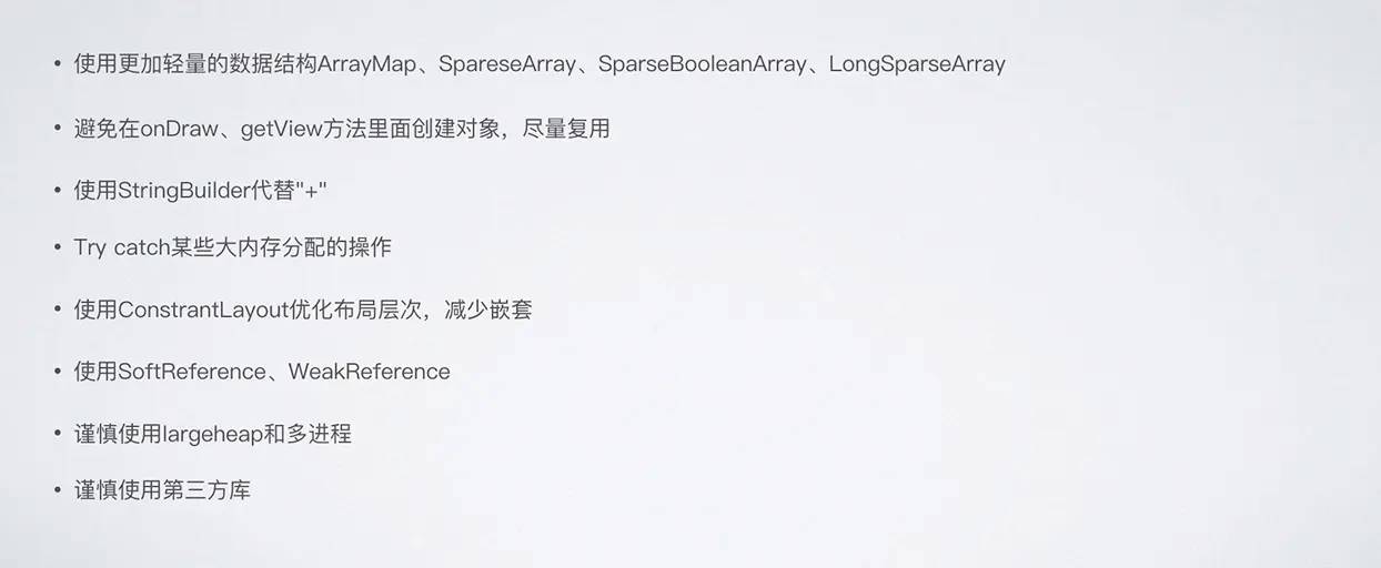 在Android中内存优化的方式实在是太多了,往细了说,到你写的每一行代码其实都和内存优化相关。在这里我从三个方面来说下Android内存优化的方法: