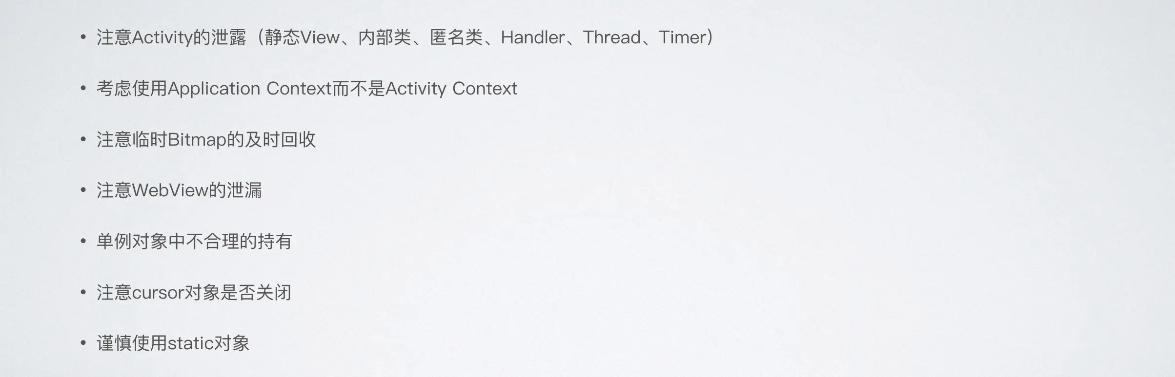 在实际开发中我们可以先考虑降低应用的运行时内存,然后针对代码写的不好的地方着重优化,最后通过规避一些可能导致内存泄漏的编码方式,去提前避免内存泄漏的问题。