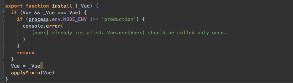 为什么声明Vue变量? 声明Vue这个变量的意义是在Vuex内部不引入Vue这个构造函数(Vue框架的代码), 而是等待Vue.use(Vuex)之后把外部引入的Vue对象传递进去。 给Vue对象的赋值操作只有在install函数内,所以Vue变量存在并且等于_Vue(这个外部传递进来的Vue构造函数)的话,代表Vuex已经完成了install, 就会有一个提示。