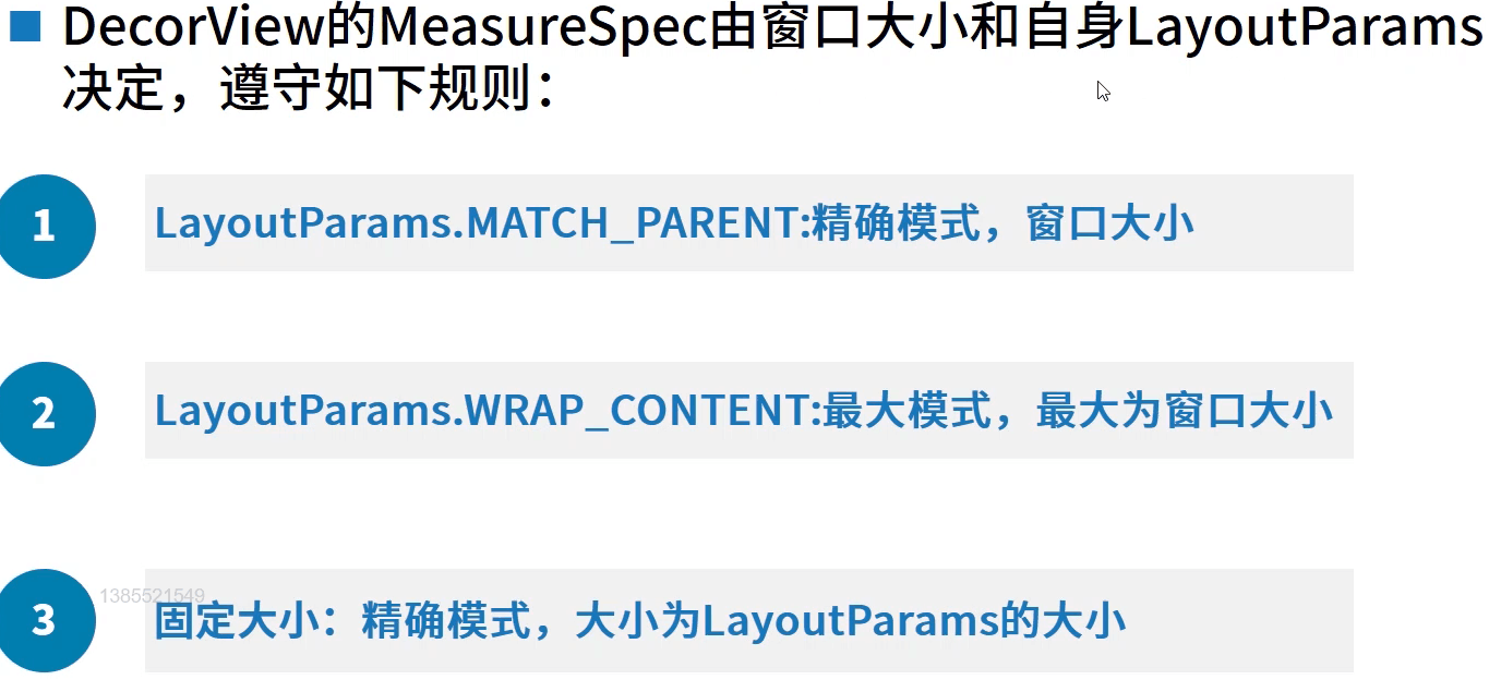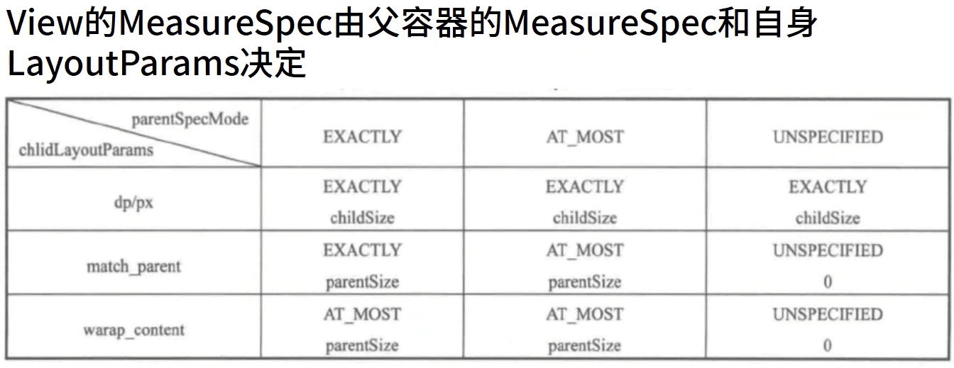 首先需要了解一下MeasureSpec类(View的内部类):MeasureSpec为测量规格,由32位的int值组成,前两位是表示测量模式SpecMode,后30位表示测量的尺寸SpecSize。