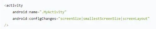 如果因性能限制等因素希望在不自动重启 Activity 的情况下处理配置更改,您需要在应用清单 manifest 中增加 android:configChanges 属性,并至少包含以下配置值: