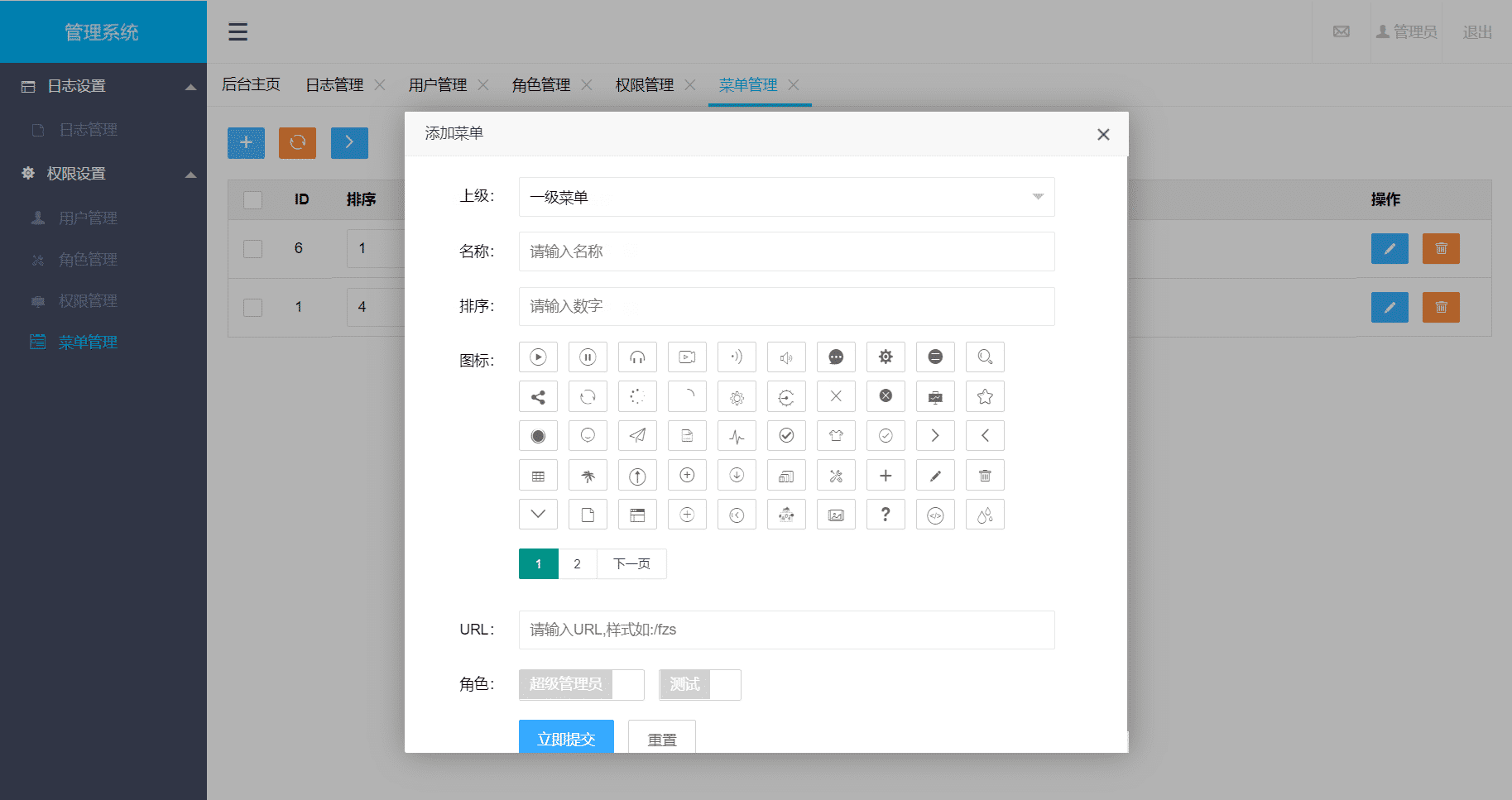 - 菜单可以设置自己的图标,可以控制哪些角色可以看到。