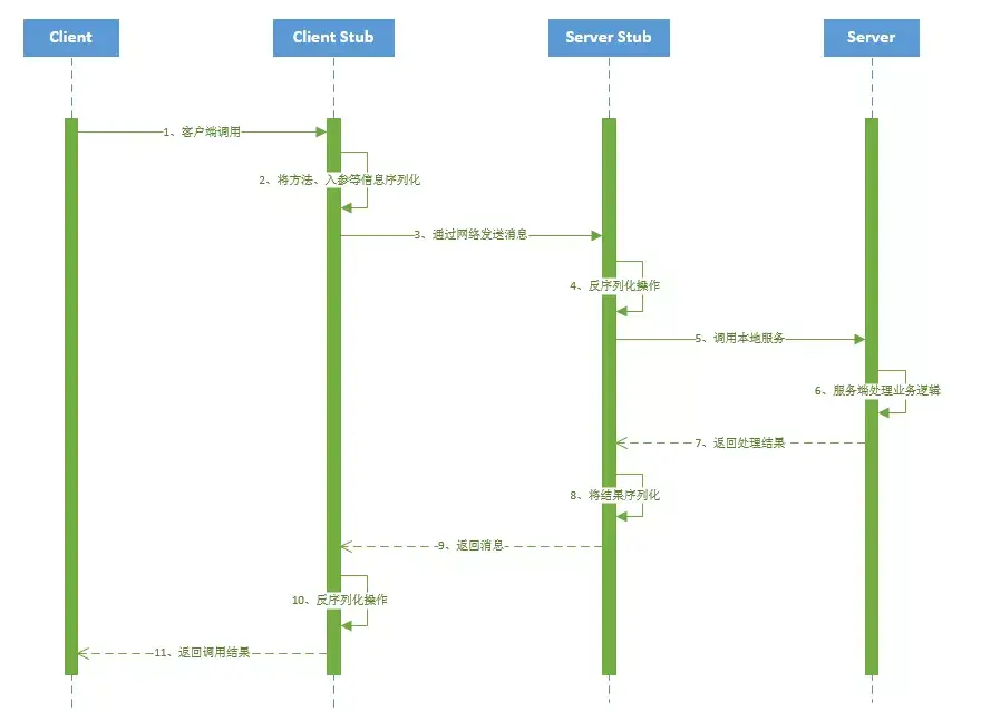 3、服务端存根(Server Stub):接收客户端发送过来的请求消息并进行解包,然后再调用本地服务进行处理