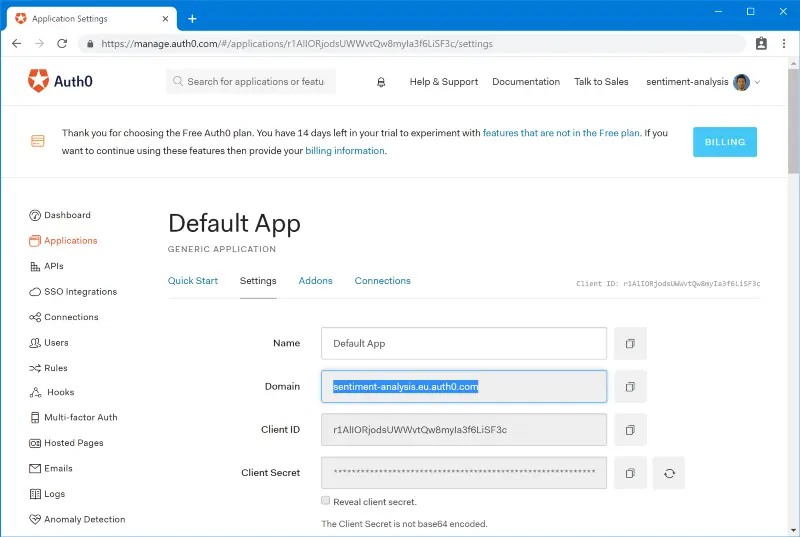 其余所需的详细信息位于Auth0 Portal中的 Applications 下 ,然后选择自动创建的与API同名的 Test Application。