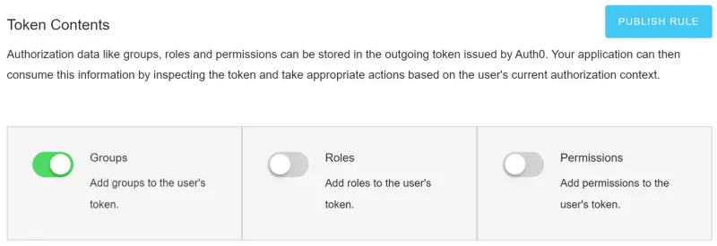 在Auth0门户中,导航到Extensions并安装“Auth0 Authorization”扩展。安装完成后,导航到授权扩展并通过单击右上角的租户并选择菜单选项“配置”进行配置。启用组,然后单击 发布规则 按钮。
