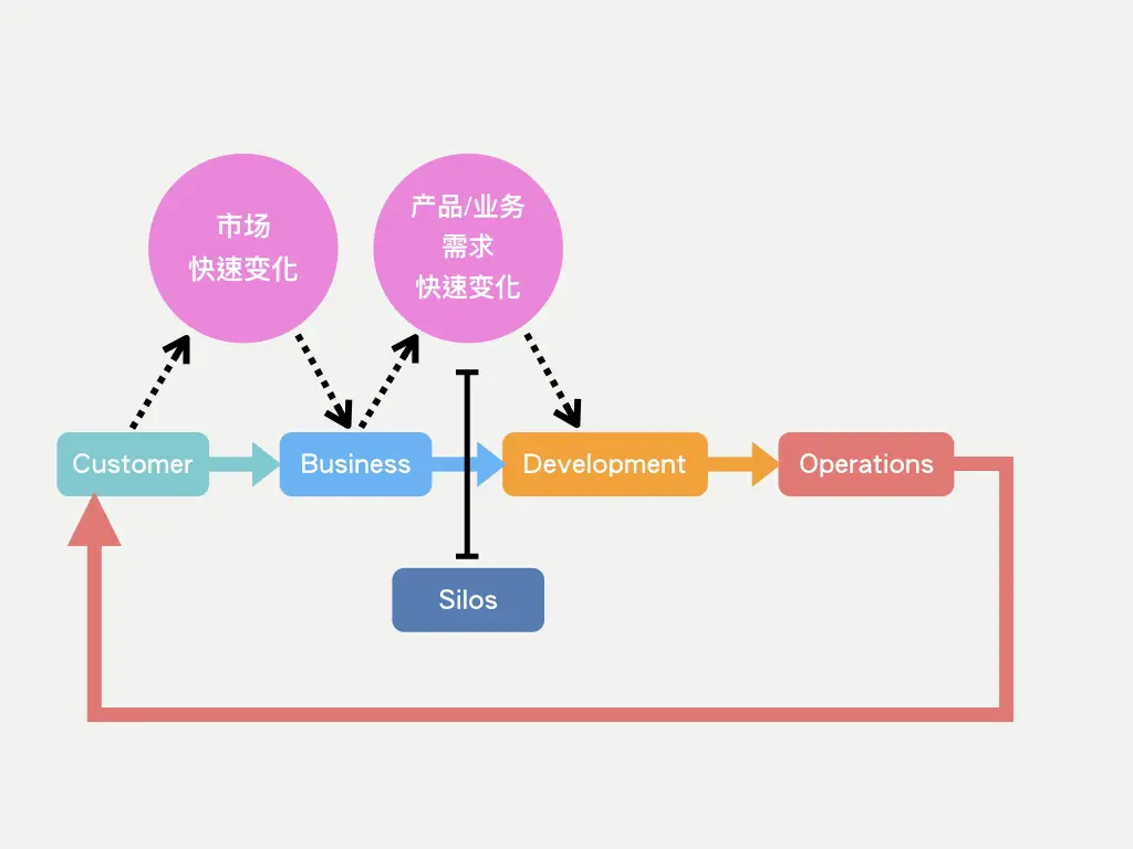 从客户这边,我们可以得知市场是快速变化的。这也会反映到业务本身,产品与业务需求同样快速变化。而常见的一个状况是“业务与研发”之间经常具有沟通、合作上的问题。