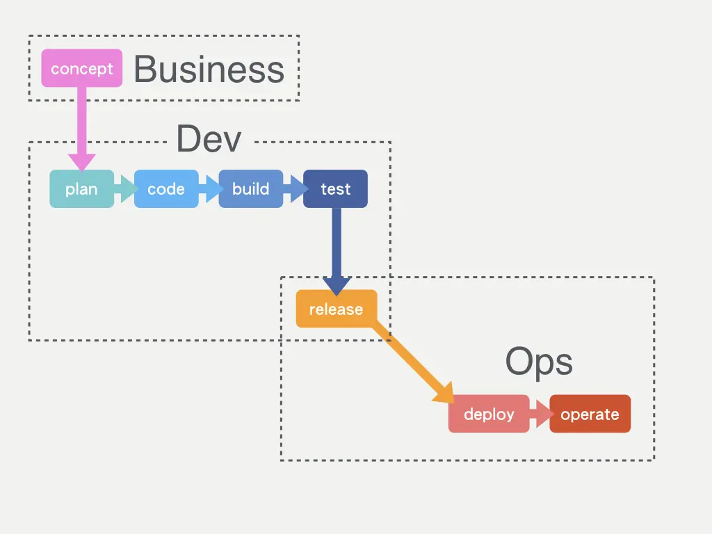 让我们换个方式说明,如果我们用软件开发流程来看,研发和运维只有在软件 release 的时候双方才会有互动与交集。
