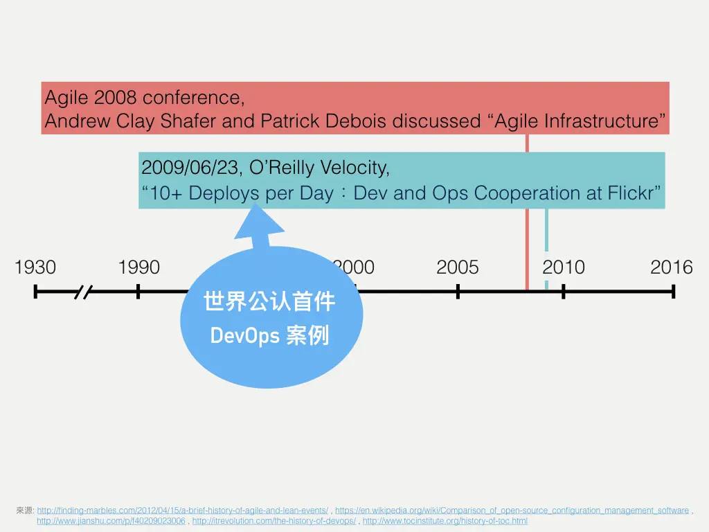首先是 2008 年的“Agile 2008 Conference”,在当时目前被人称为 DevOps 之父的 Patrick,在当年想要找人讨论“Agile Infrastructure”。