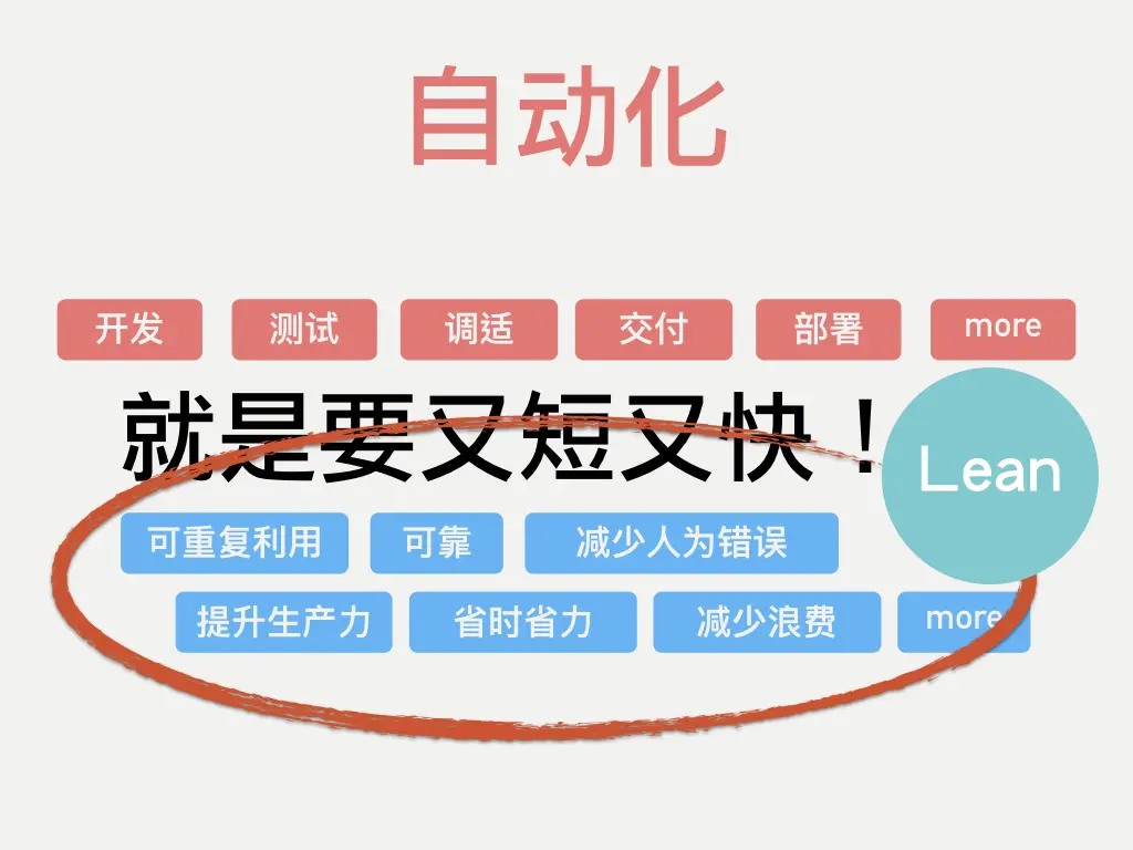 自动化,以结果而论,可以说就是让软件研发至运维流程中的各个环节能够“又短又快”,并为企业带来一些实质的益处,像是提升可靠性、减少人为错误、提升生产力、减少浪费……而在这背后,你会发现跟精益的精神是密切相关的。