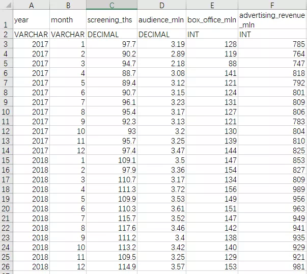 图1是小编随意编造的一组很简单的数据,表头包括年、月、场次、观众人数、票房及广告收入,用英文表示是为了之后写SQL的时候方便一些。