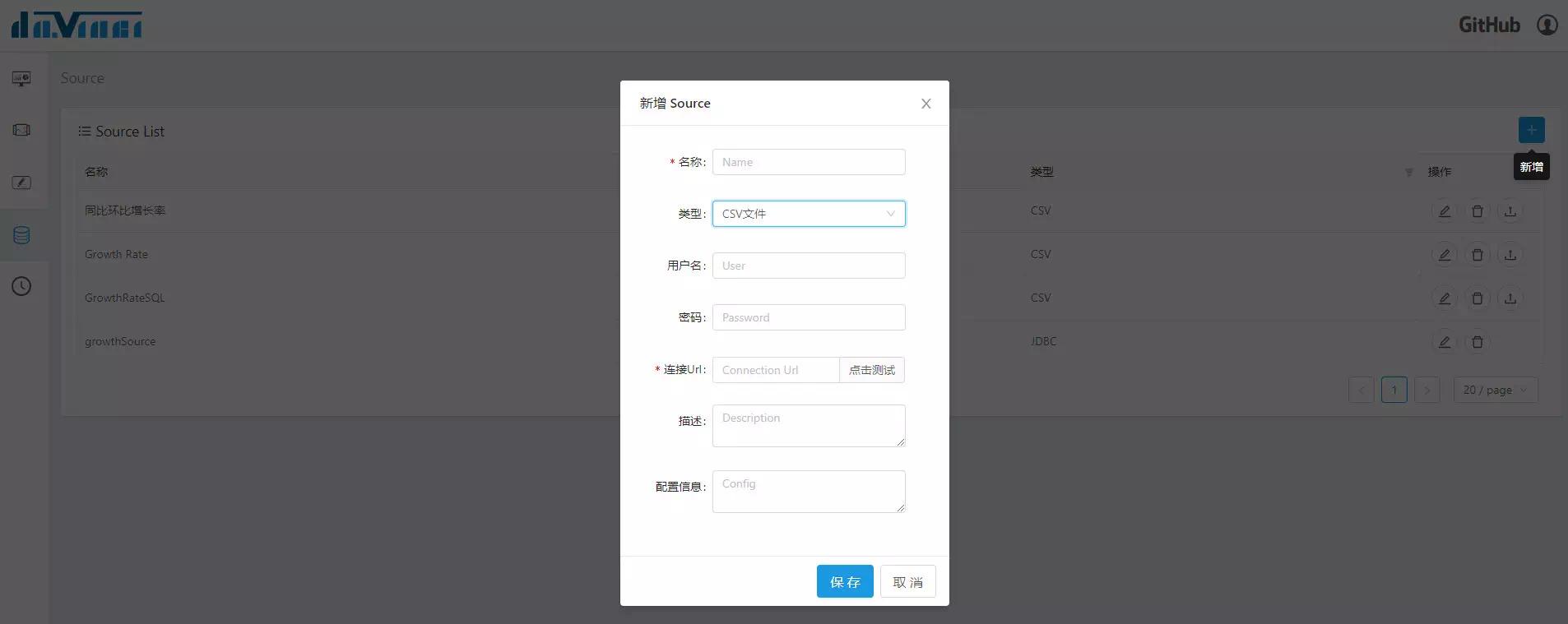 点击Source界面右上角“+”,在Source List里新增数据源(图2),上传CSV文件至指定数据库中(图3),小编使用的数据库为MySQL。