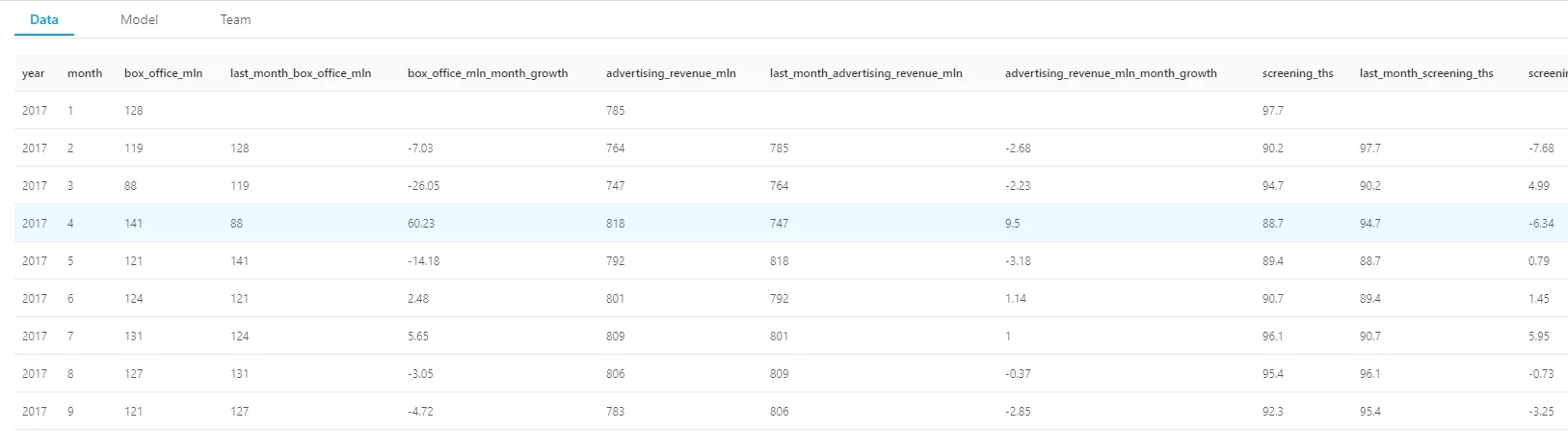 select g1.year,g1.month, g1.box_office_mln, g1.last_year_month_box_office_mln, round((g1.box_office_mln - g1.last_year_month_box_office_mln)/g1.last_year_month_box_office_mln * 100.0, 2) as box_office_mln_year_growth, g1.advertising_revenue_mln, g1.last_year_month_advertising_revenue_mln, round((g1.advertising_revenue_mln - g1.last_year_month_advertising_revenue_mln)/g1.last_year_month_advertising_revenue_mln * 100.0, 2) as advertising_revenue_mln_year_growth, g1.screening_ths, g1.last_year_month_screening_ths, round((g1.screening_ths - g1.last_year_month_screening_ths)/g1.last_year_month_screening_ths * 100.0, 2) as screening_ths_year_growth, g1.audience_mln, g1.last_year_month_audience_mln, round((g1.audience_mln - g1.last_year_month_audience_mln)/g1.last_year_month_audience_mln * 100.0, 2) as audience_mln_year_growth from (select g.year, g.month, g.box_office_mln, lead(box_office_mln) over(partition by g.month order by g.year desc) as last_year_month_box_office_mln, g.advertising_revenue_mln, lead(advertising_revenue_mln) over(partition by g.month order by g.year desc) as last_year_month_advertising_revenue_mln, g.screening_ths, lead(screening_ths) over(partition by g.month order by g.year desc) as last_year_month_screening_ths, g.audience_mln, lead(audience_mln) over(partition by g.month order by g.year desc) as last_year_month_audience_mln from GrowthRate_SQL g order by g.month, g.year desc) g1;代码块7
