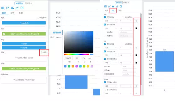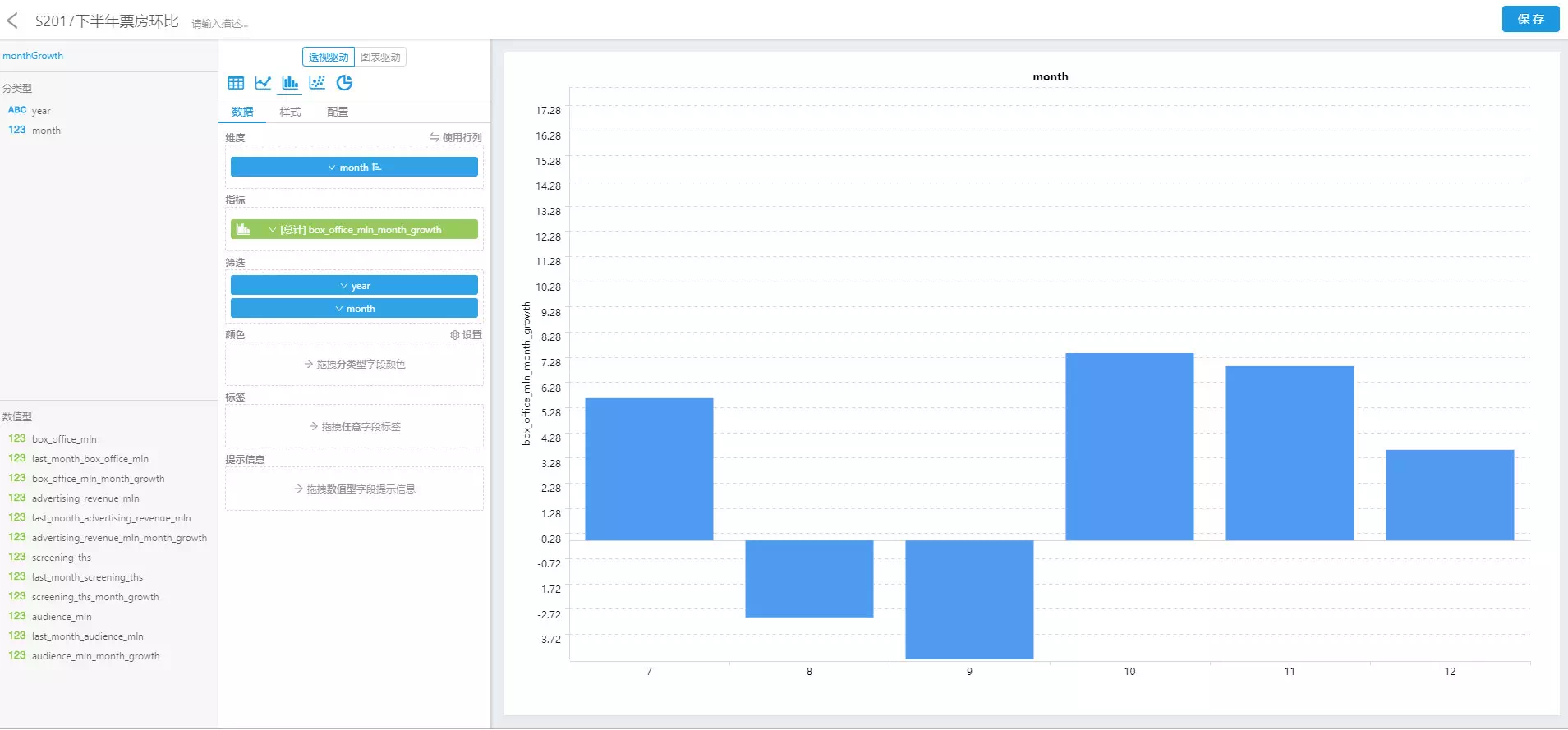 例如,小编想要了解一下2017年下半年各月票房的环比增长率趋势,用透视驱动中的柱状图表示。在这个需求中,简简单单拖拽几个字段就能配制出小编想要的图表。
