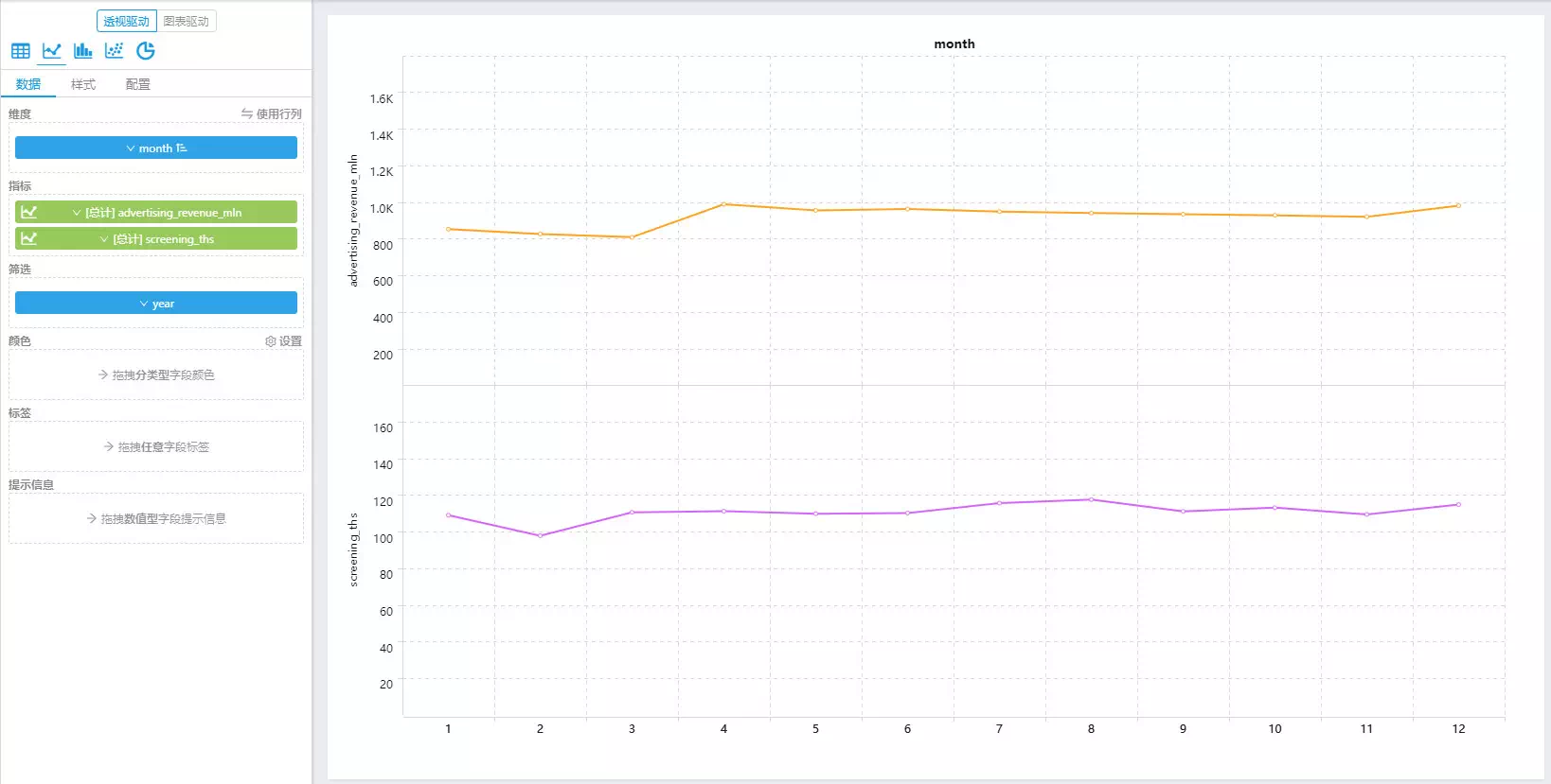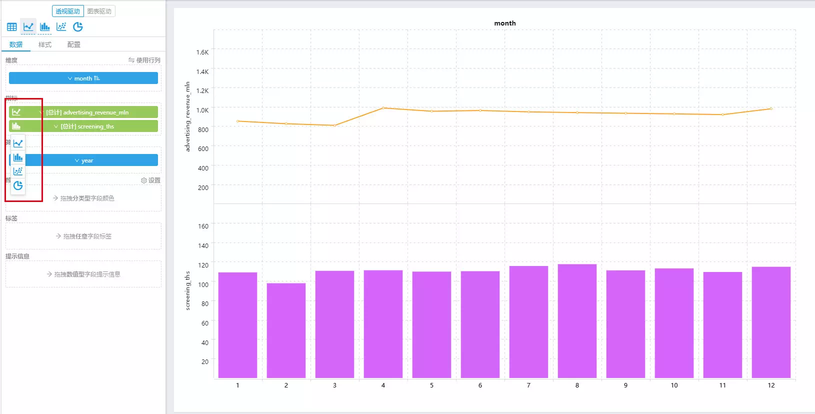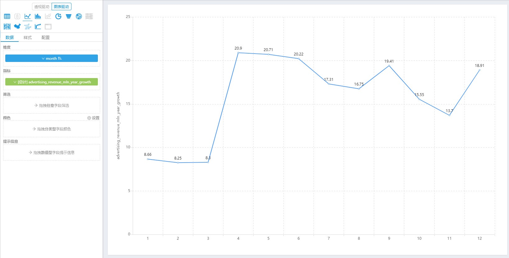 同样,将“month”字段拖入维度栏,“广告收入同比增长率”字段拖入指标栏。