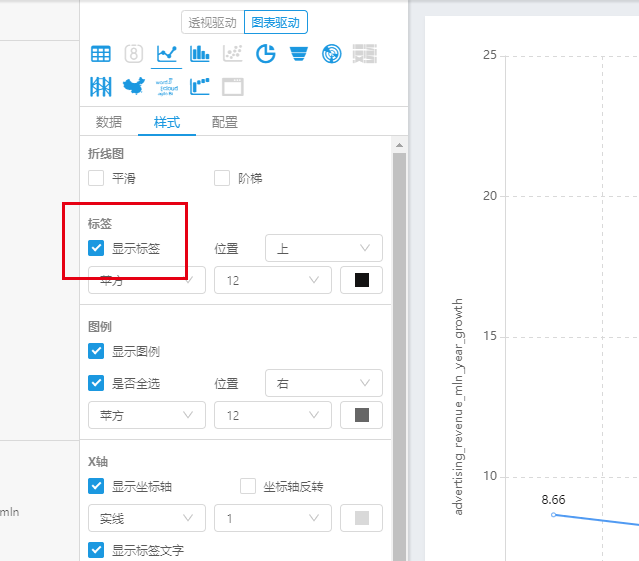 勾选样式配置中的“显示标签”,数字就出现在了折线图中(图17)。