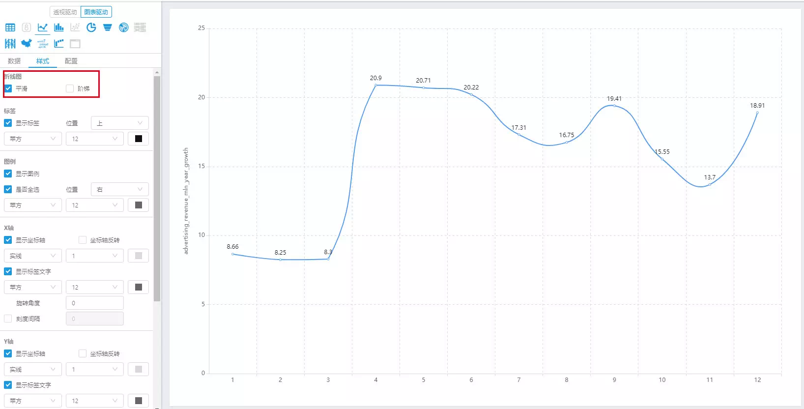 且慢!小编似乎发现了折线图可以变换面貌。点击了一下,发现果然平滑的折线图更符合小编心意。于是最终的“2018年各月广告收入同比增长率”折线图制作完成!(图18)