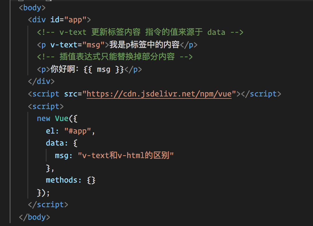 v-text 更新整个标签中的内容,差值表达式:更新标签中局部的内容,不能渲染识别标签