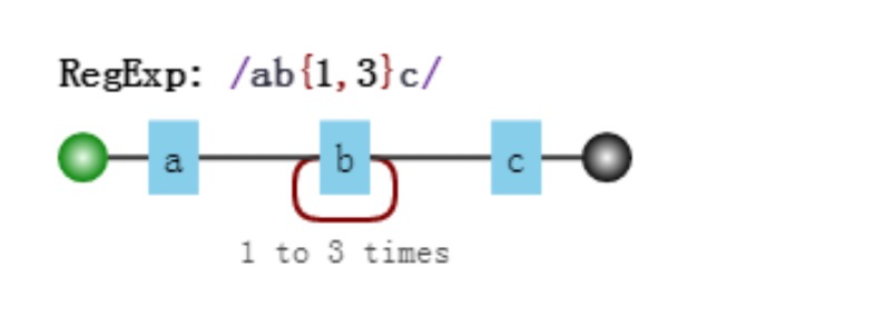 假设我们的正则是 /ab{1,3}c/,其可视化形式是:
