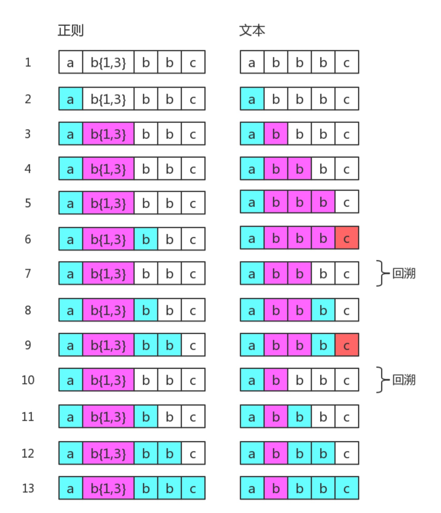其中第 7 步和第 10 步是回溯。第 7 步与第 4 步一样,此时 b{1,3} 匹配了两个 "b",而第 10 步与 第 3 步一样,此时 b{1,3} 只匹配了一个 "b",这也是 b{1,3} 的最终匹配结果。