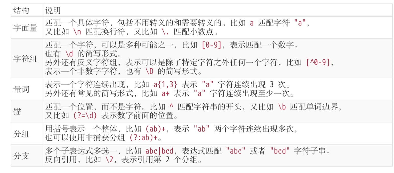 字符字面量、字符组、量词、锚、分组、选择分支、反向引用。