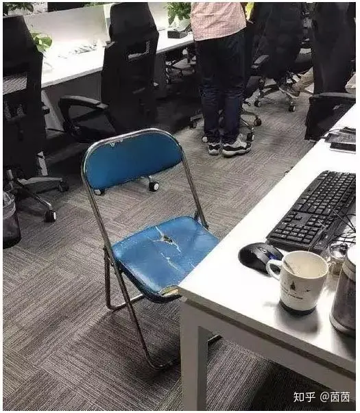 贴文的最下端直接晒出椅子,通过图文可以看出这张椅子破烂不堪,中间还破了很多洞,也不是旋转椅子,和周边其它工位形成鲜明的对比。