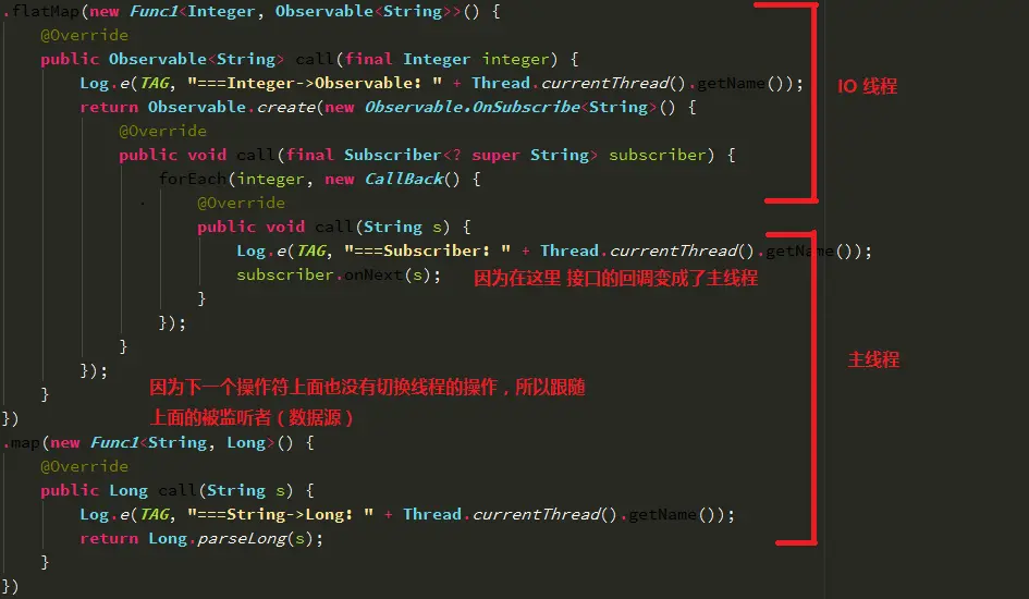 看清以上两点,我们分析一下,flatMap()以上的结果大家肯定都能想出来,我们就直接从flatMap()开始分析了,都知道了回调的接口里面的线程为主线程,那么它作为被观察者它下面的操作符按照 RxJava 线程切换的基本原理来说,肯定也是主线程。