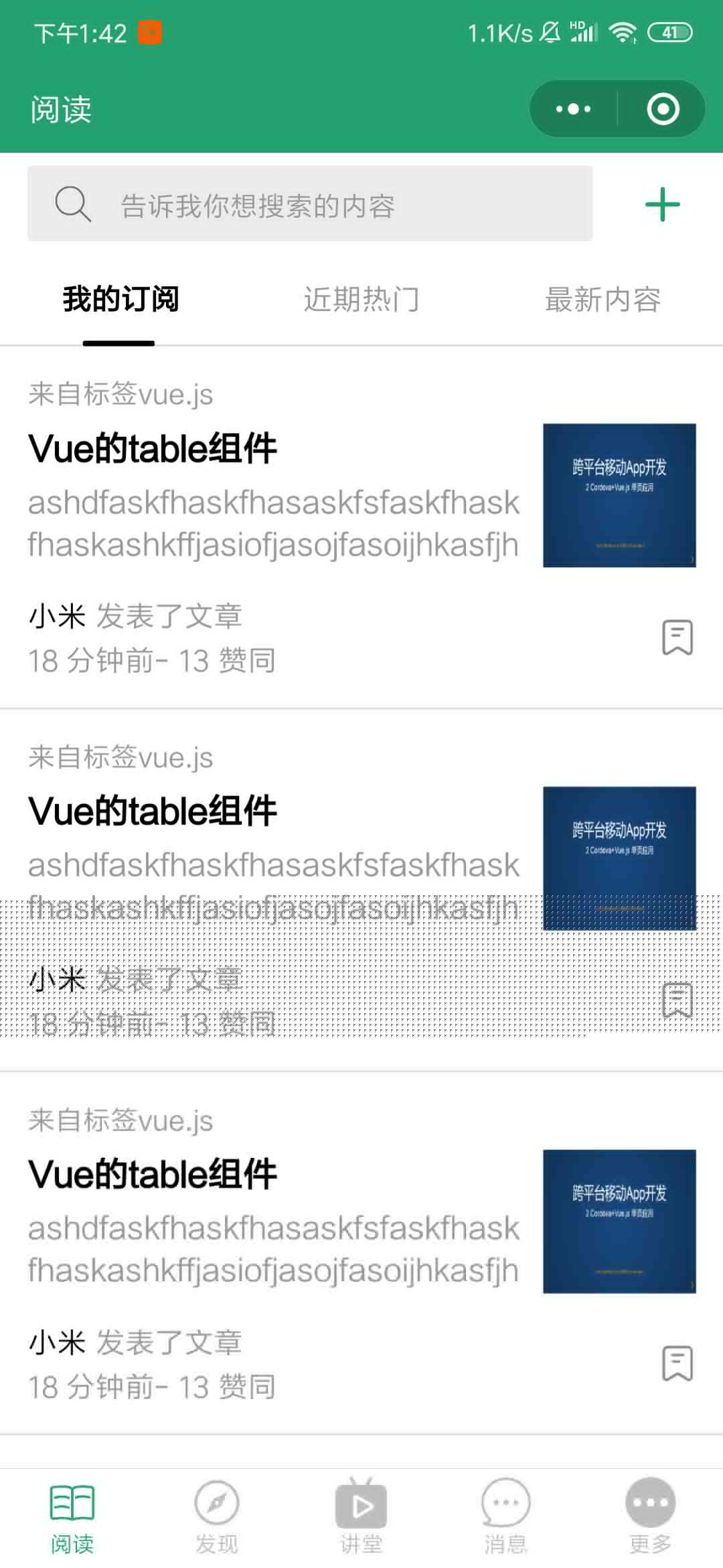 主要功能:我的订阅和近期热门和最新内容支持左右滑动,模仿SF思否app交互式,嵌入一个swiper和N个scroll-view这样我们就可以分开视图滚动和切换视图。