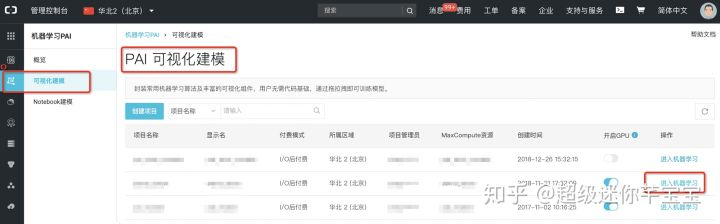 我们知道这个问题可以通过回归算法来解决,就兴致冲冲的打开了PAI 可视化建模页面进入了自己搭建的机器学习项目。进入方法如下: