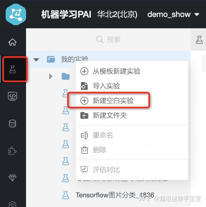 - 首先进入PAI 可视化建模页面,点击实验-新建空白实验。