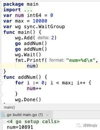 代码中共享变量num是一个简单的计数器,main主线程启动了两个协程,分别循环一万次对num进行递增操作。正常情况下,预期的结果应该是1w+1w=2w,但是,在并发执行的情况下,最终的结果只有10891,离2w差的好多。